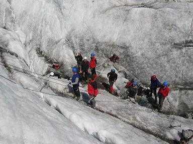 Allez, c’est parti ! On a les échelles à descendre car la mer de glace fond à vue d’œil malheureusement. Les premières émotions commencent pour certains car c’est impressionnant de descendre ces échelles avec le vide en dessous. Mais la bonne humeur est là et hop nous voici sur la mer de glace. Le guide apprend aux débutants les bases de la marche à crampons. Pas toujours facile, n’est ce pas Virginia ?! Mais on s’en sort plutôt pas mal pour des grands débutants tandis que les plus expérimentés escaladent des murs plus raides.