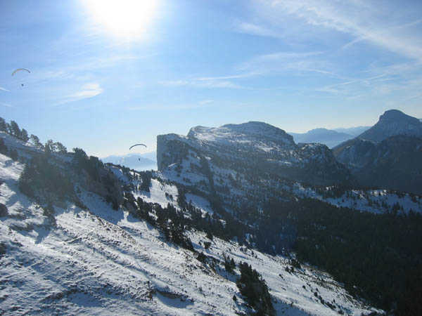 Mercredi 27, je propose un vol de Chamechaude (dénivellé 700m – alt 2082m). Nous ne sommes que deux. La montée nécessite de bonnes chaussures de montagne et des batons car le sentier est assez glacé. Arrivés au sommet, nous nous installons sur des banquettes d’herbe à moitié enneigées pour décoller dans une petite brise de face. Au pilier sud, l’ascenseur est là et nous permet un vol d’une heure en survolant le sommet.