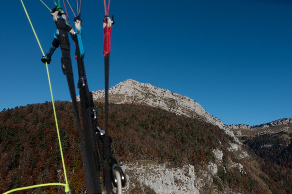 J’avais annoncé 750m et nous en gravîmes finalement 900, La Grande Sure se mérite. Après avoir repéré l’atterro avec Boris, un nouveau qui découvre le site, on se retrouve à 6 vaillants membres du CHVD au parking des 3 Fontaines. Muni de la trace que j’avais, au préalable, enregistrée sur mon iPhone via l’app Iphigénie, nous attaquons la montée dans la forêt. Il est 14h, nous sommes partis pour un peu plus de 2h de rando. Le chemin n’est pas balisé et les feuilles d’automne couvrent le sentier. Sans une bonne carte IGN on risque de sérieusement galérer. Finalement nous débouchons sur l’alpage au niveau du chalet de Jusson. Il reste encore 150m avant d’arriver au déco. La flamme, attachée à un poteau par les locaux, nous indique que c’est un peu travers gauche mais pas violent. En se déplaçant sur l’alpage on arrive à trouver un bout de pente bien orienté. Je décolle en premier et je descends doucement vers l’atterro dans un air très calme. L’horizon immense se fond dans la brume. Je survole un spectacle magnifique où le bleu intense du ciel se marie avec une symphonie de taches orange, jaune, marron et vert découvrant par endroit de grands pans de roche verticales. Je repère facilement l’atterro dès que j’ai franchi la crête en contrebas du déco. Pas un pet de vent, on peut poser dans n’importe quel sens.