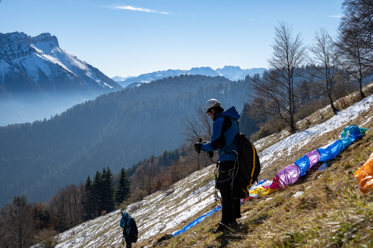 Le matin nous partons assez tôt. Nous nous retrouvons à St Pierre d’Albigny avec Ludo et sa compagne qui marchera avec nous. Simon-Pierre déclare forfait (découragé devant sa tasse de café et les prévisions?). Nous montons par le col du frêne jusqu’à La Compôte, les champs sont gelés, ça meule. Nous nous garons sur la piste qui démarre la randonnée, dans la petite combe sous le décollage, puis nous poursuivons à pied. On file sur cette piste forestière sympa. En haut, pas un souffle d’air ou presque. Le déco n’est même pas alimenté, heureusement il est particulièrement raide, ça aide. On Ploufe joyeusement. Les Bauges resteront épargnés par le grand vent annoncé.