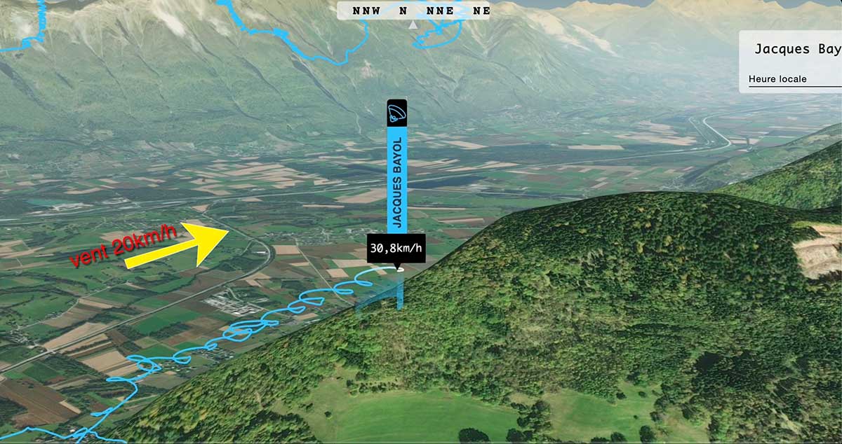 Lors d’un vol à Montlambert je transite depuis les tours de Montmayeur vers Champlaurent. Le vent est assez fort, il renforce la brise habituelle dans ce secteur. Je mesure des pointes à 70km/h vitesse sol pendant la transition. Je raccroche sous Champlaurent et commence à enrouler un thermique assez puissant (+2-3m/s) qui décale dans le sens du vent orienté ouest à 20km/h.
