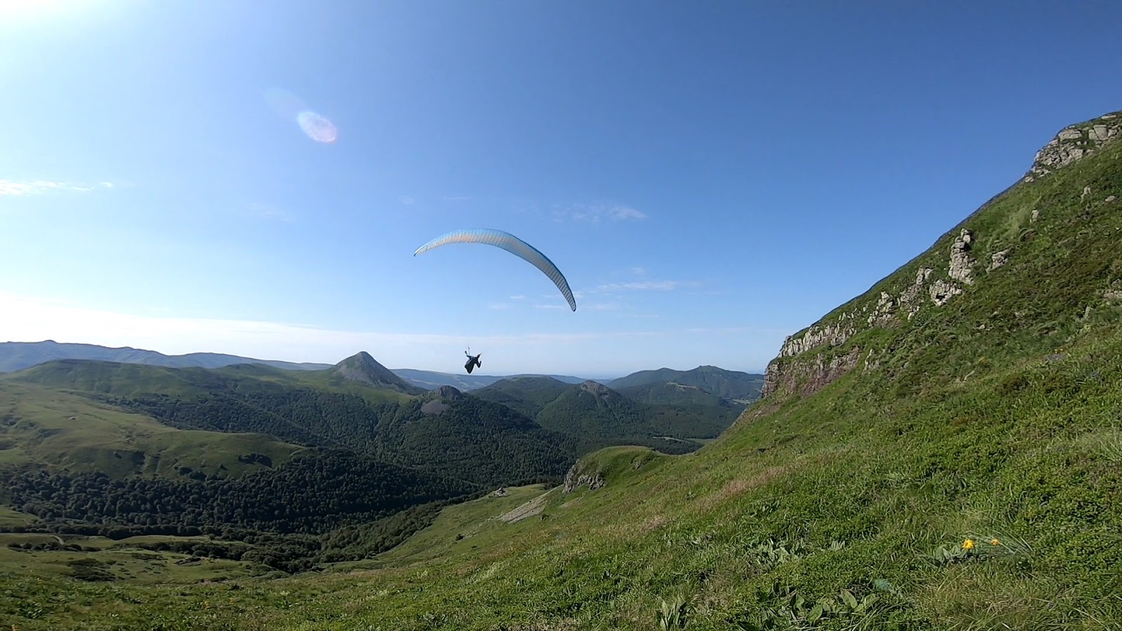 Elle commence par un vol dès les premiers rayons du soleil pour descendre du plateau du Cantal jusqu’à un fort sous le Rocher de la Boyle. Un petit moment suspendu dans les airs et dans le temps avant de louper la balise du rocher de quelques mètres. La remontée à pied dans les pentes pour valider le cylindre de 400 mètres est obligatoire.