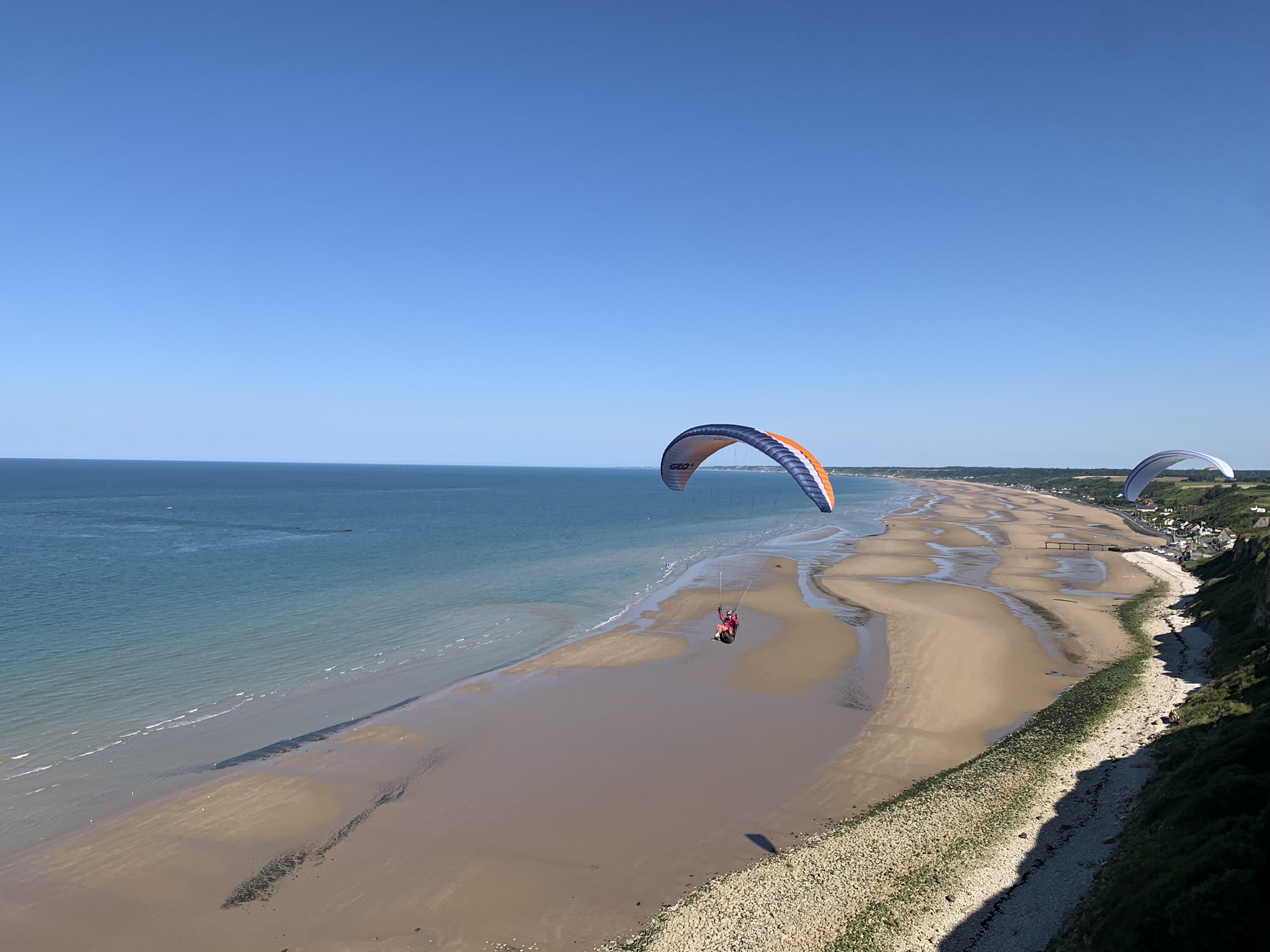Les conditions s’annoncent mauvaises avec pluie, tonnerre au loin et pas assez de vent, c’est donc naturellement qu’on se dirige vers le décollage de Commes. Devant une assemblée de locaux, y compris des biplaceurs pro contemplatifs, Lucas fera fusible. Et oui, ça tient ! C’est parti pour un décollage digne d’une mass-start. Les conditions sont finalement idéales pour la traversée mythique vers Arromanches, sur les précieux conseils d’Hubert. Florent et Amaury sont les 2 seuls à tenter la traversée de Port-en-Bessin. Seul Amaury en reviendra pour boucler un cross de 25km. Florent préférant agrandir son triangle avec un point au (far) ouest, à Coleville, et retour jusqu’à ce que le vent faiblisse juste avant la traversée retour.
