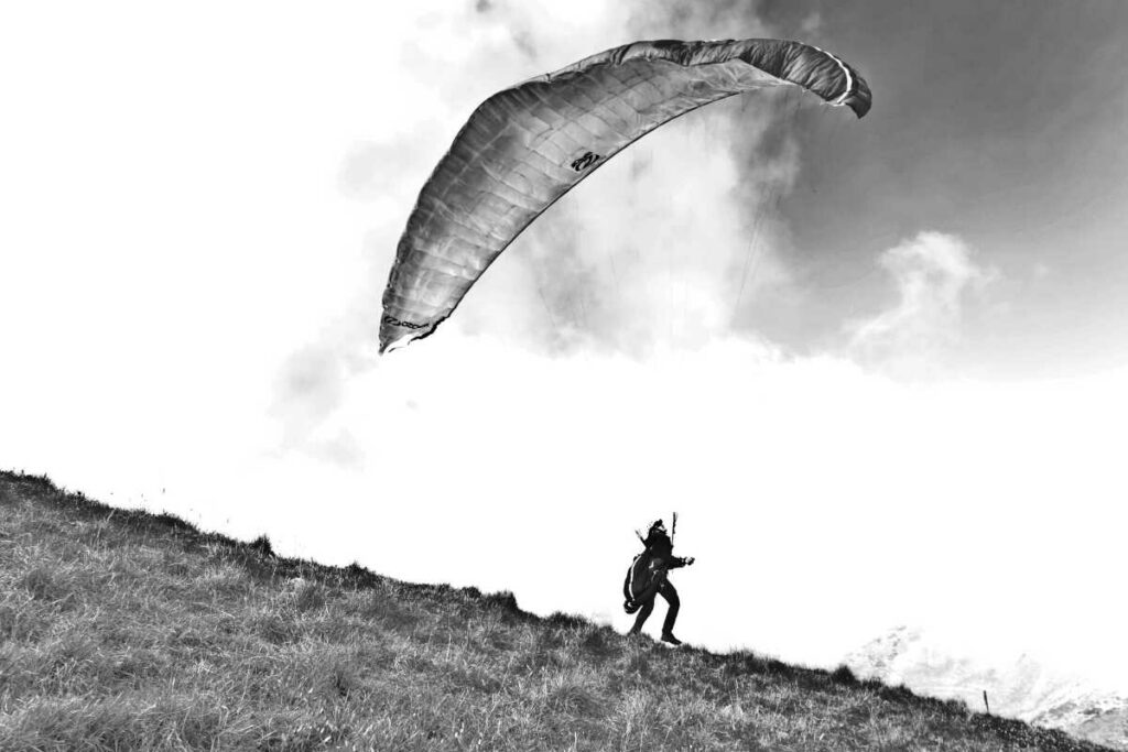 Et là on constate que le brise qui monte du sud est bien installée. Ce sera le cas au sommet avec les options suivantes: (1) on décolle sur la forte pente S : c’est bien raide et c’est direct dans le coton qui se condense sur ce côté là. (2) on décolle sur la pente NE, un peu moins raide mais quand même, dans les courts moments où la brise se calme. (3) il y a enfin la pente nord, beaucoup plus sécurisante, mais là aussi il faut attendre un calme relatif de la brise et être bien dynamique. Trois d’entre nous ont choisi l’option 2, avec plus ou moins de bonheur (c’est ici que je reste pudique). Fred et moi avons bouriné sur la pente nord.