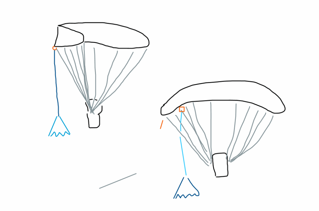 Il semble sur les photos, qu’une fois en tension au moment du gonflage, l’élastique par effet boomerang a ramené le Skybean dans le suspentage au début de la course d’envol et ainsi a provoqué une clé ou une cravate dans la voilure qui c’est ré-ouverte tout de suite après l’envol ( données constructeur, l’élastique passé dans les suspentes ne peut pas empêcher le déploiement de l’aile).