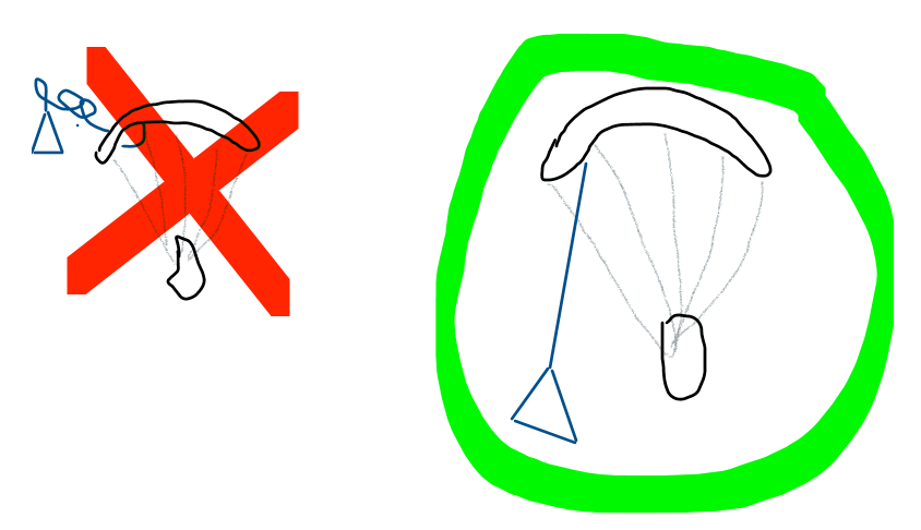 Ce que j’ai fait au Pérollier est la configuration la plus problématique car une fois tendu, l’élastique projette le Skybean vers les suspentes d’autant plus si le mousqueton d’attache est près du centre de l’aile.