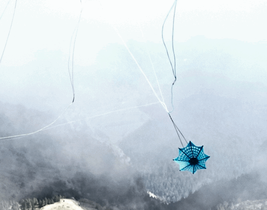 Sur ce décollage, j’ai installé le Skybean mousquetonné sur une patte d’attache de suspente de frein assez près du centre de l’aile puis après avoir soigneusement lové l’élastique , j’ai l’ai mis sous l’aile avec le Skybean.