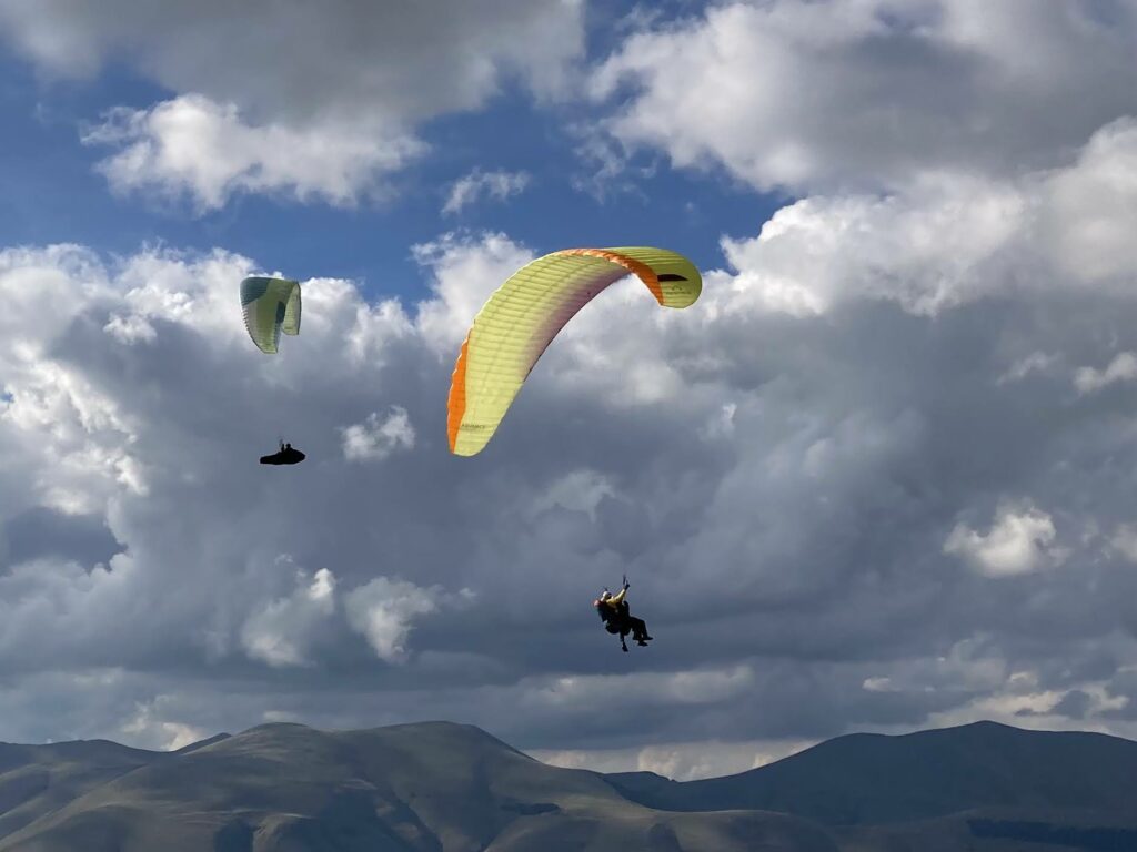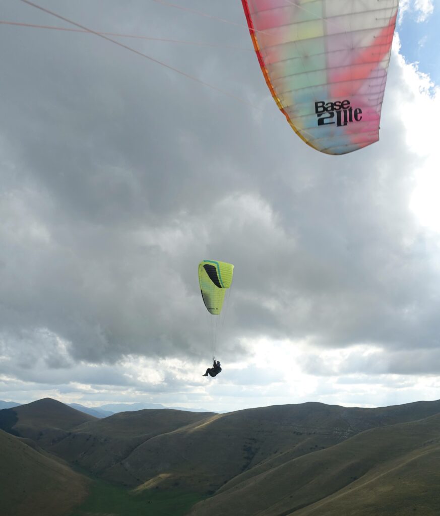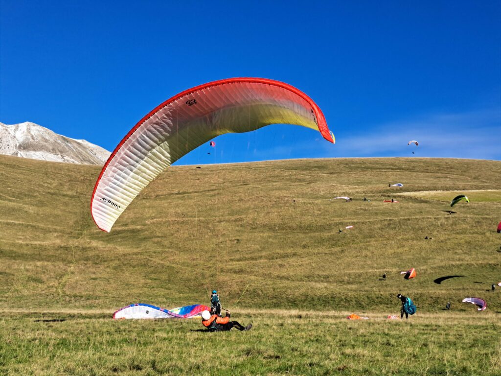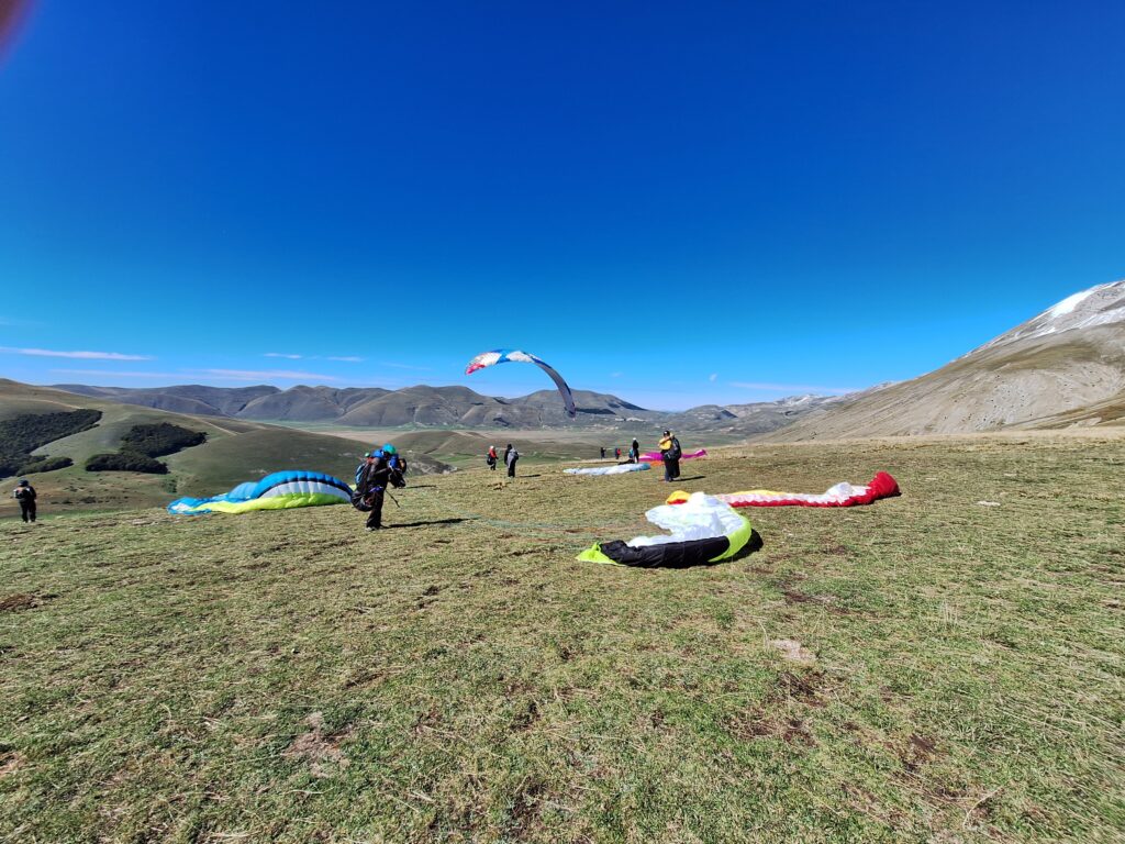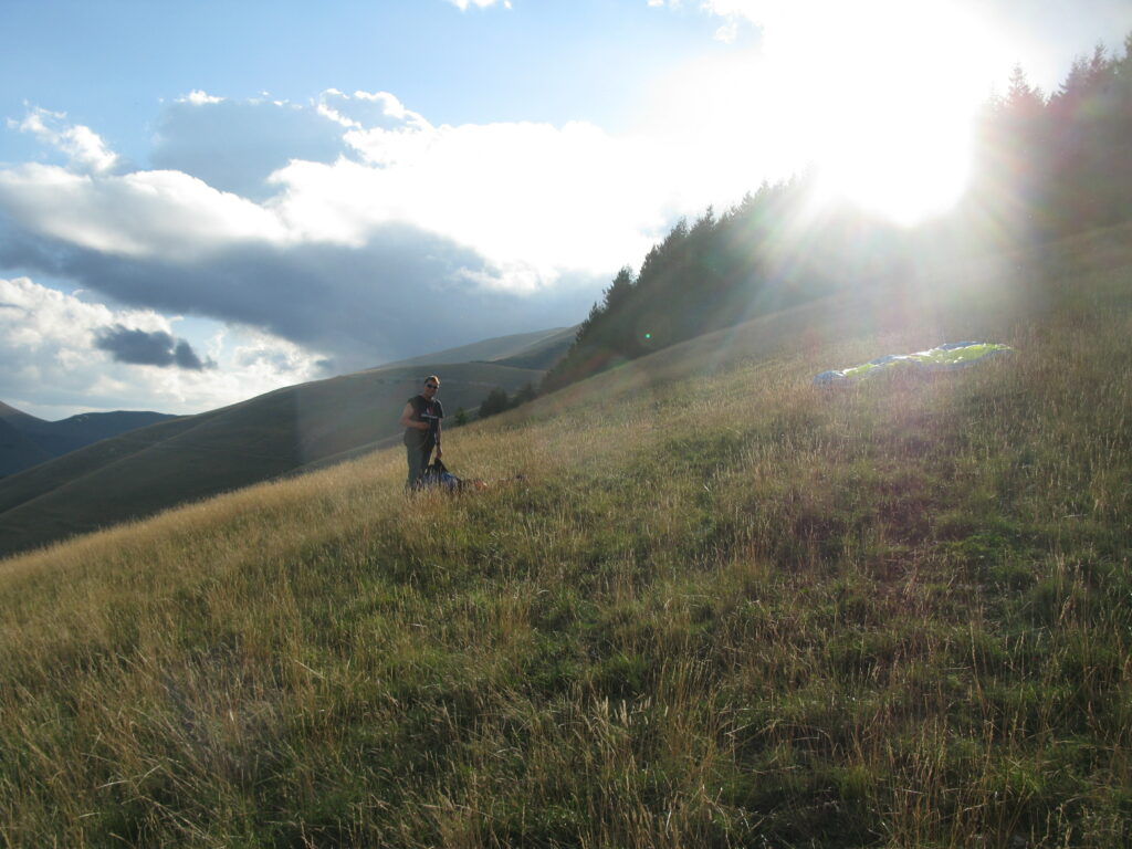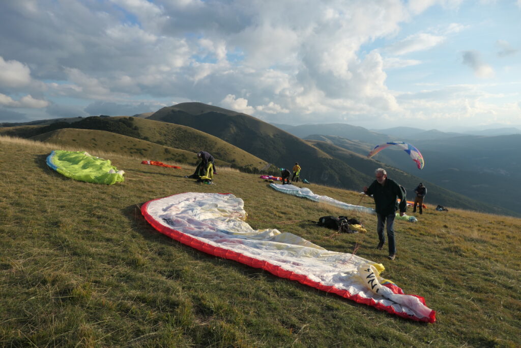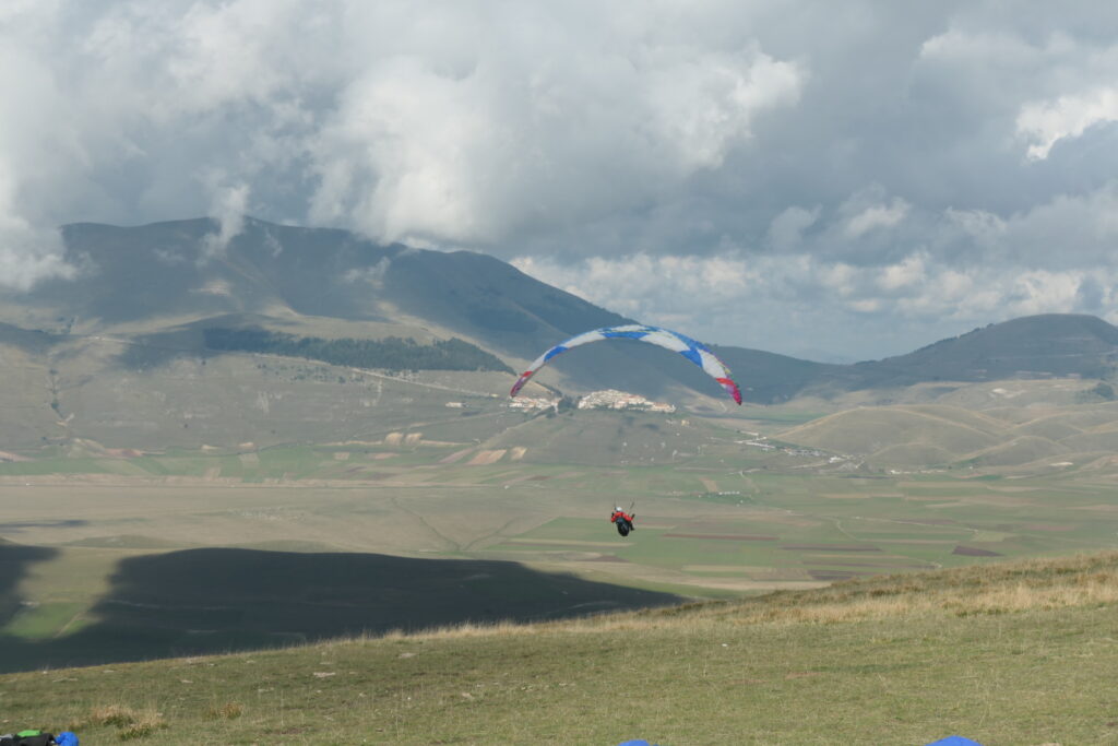 C’est effectivement idéal. On gonfle longuement; Puis on décolle pour un petit soaring en dynamique devant… Et là surprise, une énorme ascendance 100m en avant du déco nous monte au plafond à 1900m. Du coup on se permet une ballade le long du Mont Vettore. Posés à nouveau dispersés dans la plaine. Gilaï assure, et repose à nouveau près de l’hôtel.