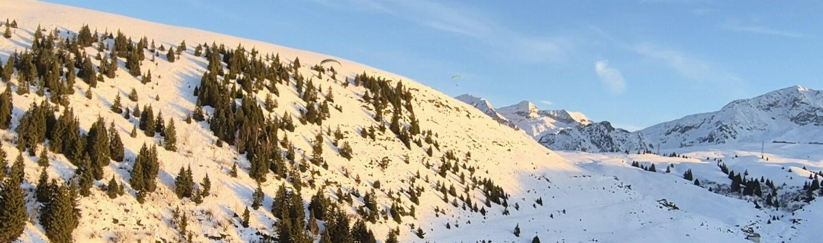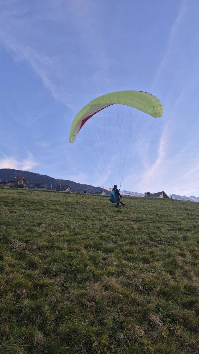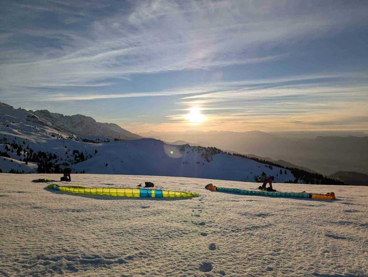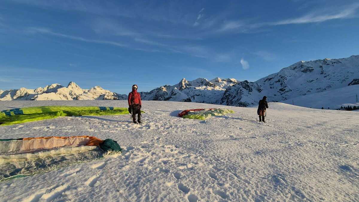 Une très légère brise de face nous accueille. On se prépare et après une course d’envol facile dans une neige dure le vol est bien tranquille. Tellement tranquille que je décide d’enlever un gant pour prendre des photos du décollage avec le téléphone. Puis je vole droit sur le champ de l’atterro et après avoir vérifié que les vaches ne sont pas là, je lance un 3.6 pour signaler le champ à Mélia et Yann. Tout le monde pose sans problème. L’herbe est humide il faudra aérer la voile ce soir !