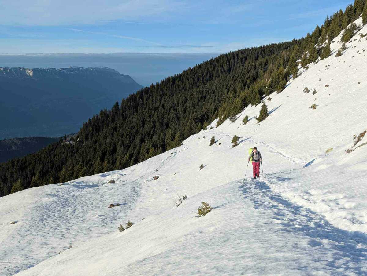 Arrivée à la sortie de la forêt, j’avais un peu peur de l’état de la neige, mais le passage des randonneurs et des raquettes ont bien tassé le chemin. C’est parfait, on s’enfonce pas !