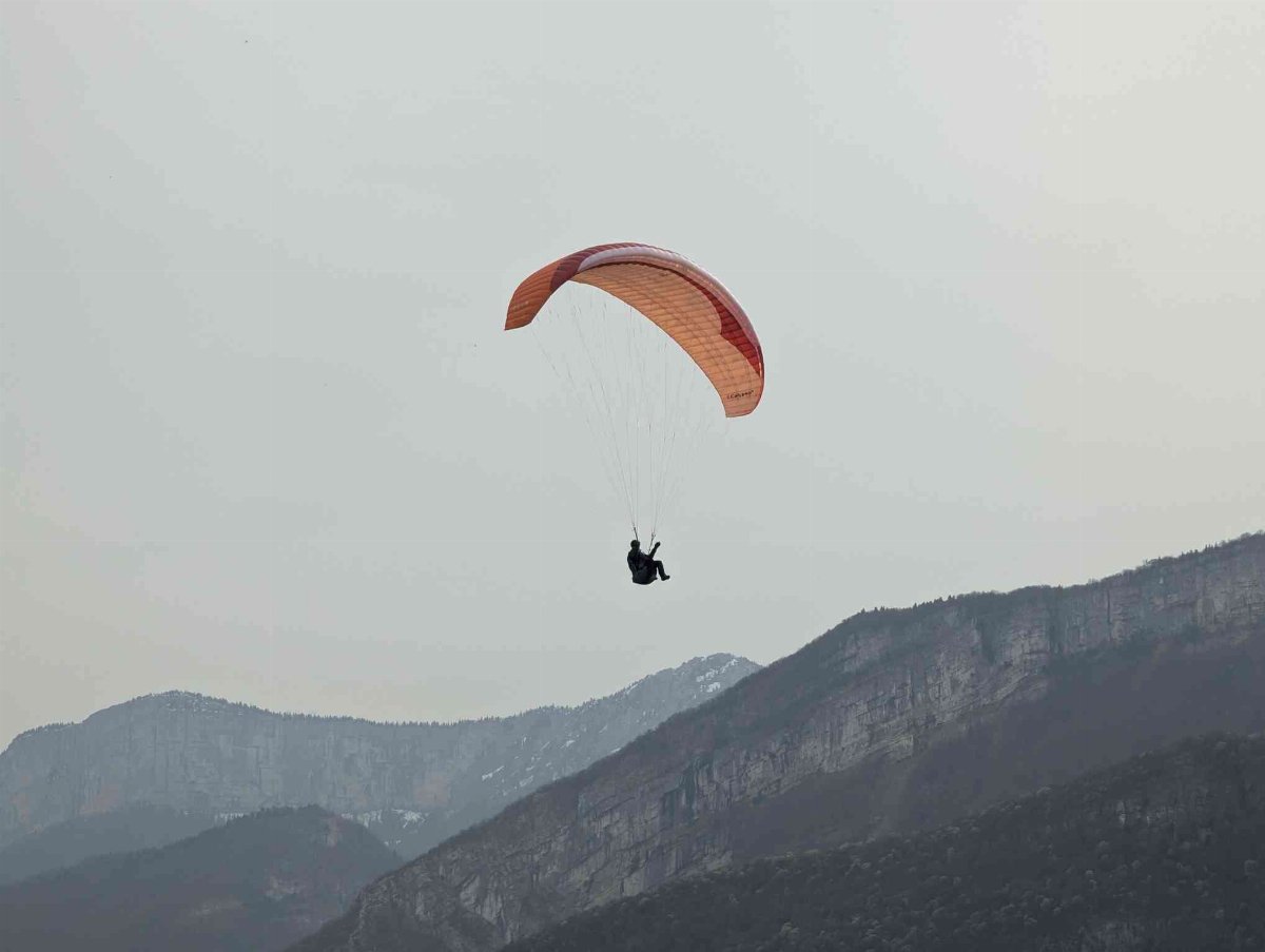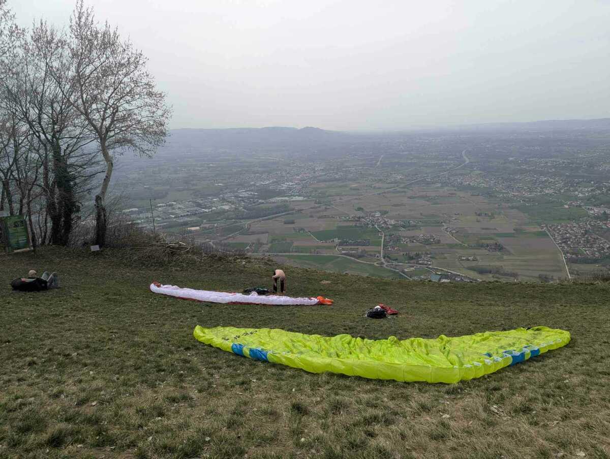Arrivés au décollage, le voile est effectivement bien là, et nous sommes seuls au décollage. Petite brise parfaite juste ce qu’il faut, je m’élance en premier, teste un peu à droite à gauche mais je ne choppe pas grand chose. Bruno par contre, qui connait bien le site, arrive à remonter au-dessus de la crête et fait un joli petit vol.